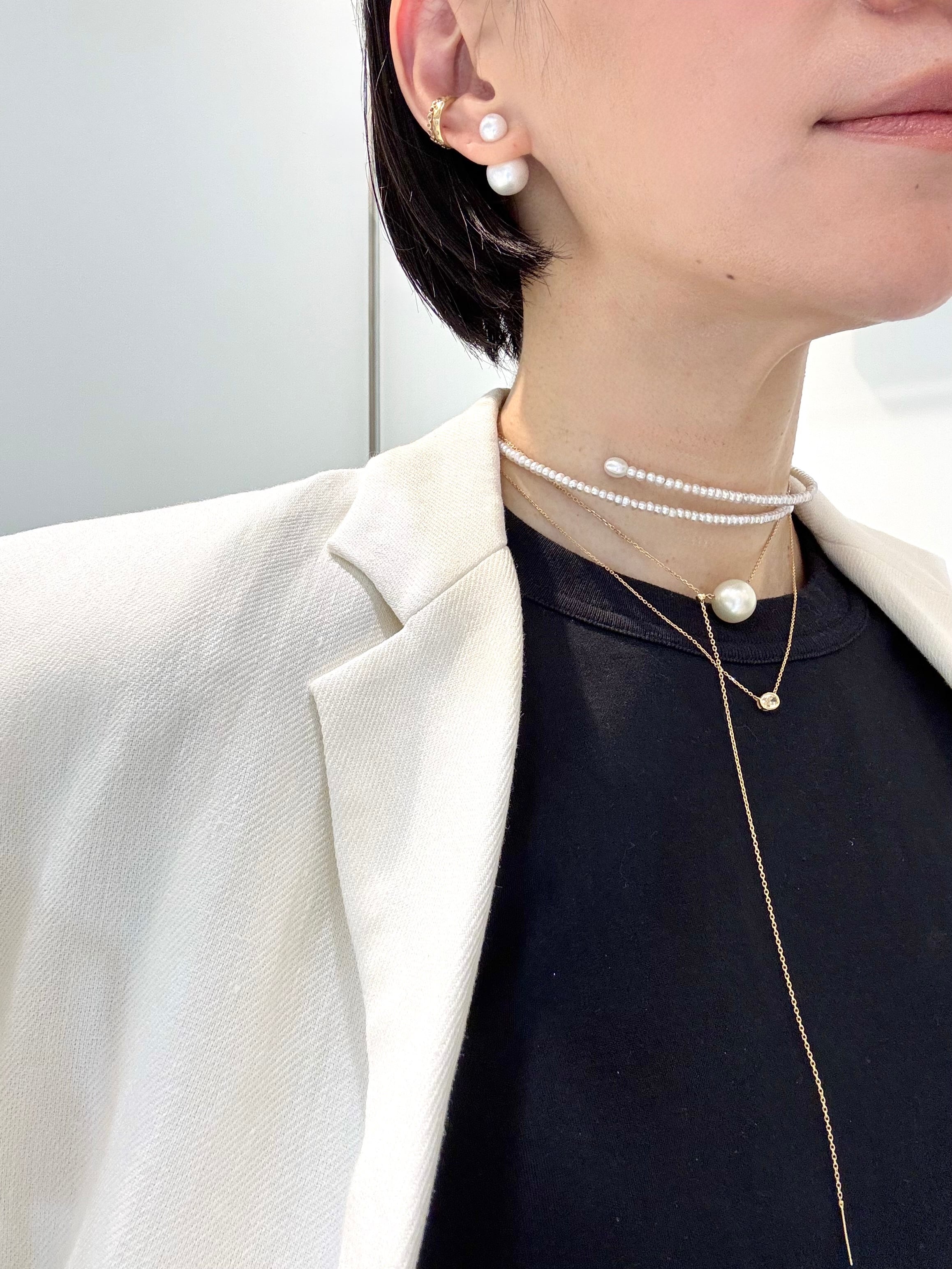 形状記憶のパールチョーカーは着脱も簡単で、前後どちらを前に付けても様になります。着けているのを忘れる位、軽くコーディネートのポイントとして活躍してくれます。